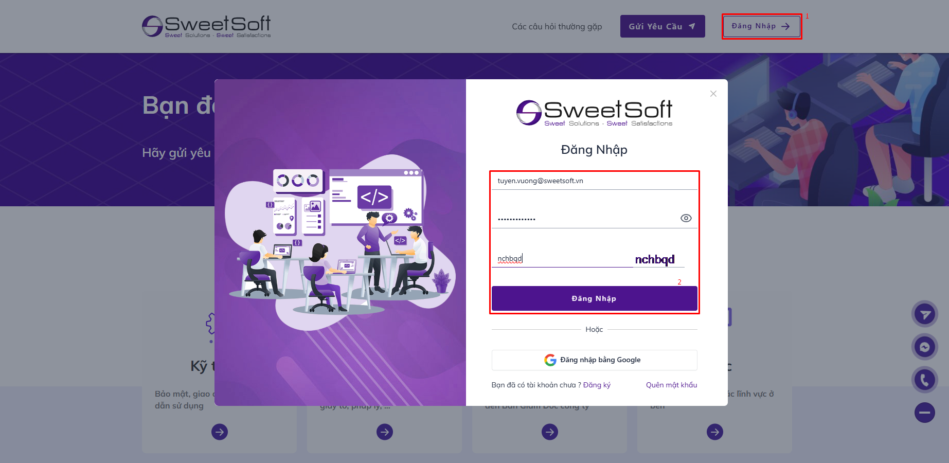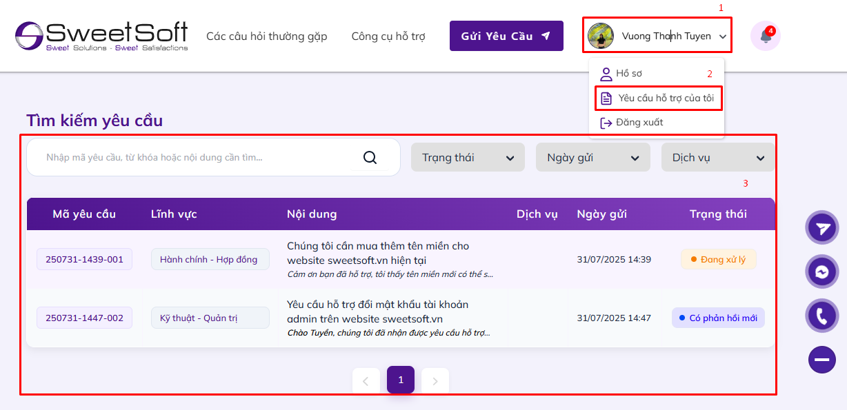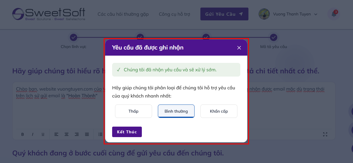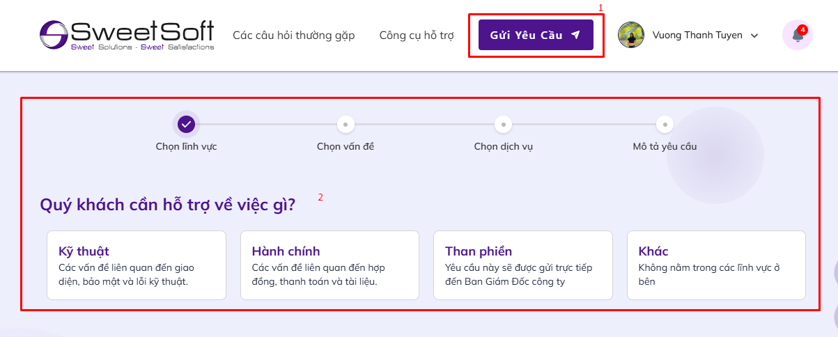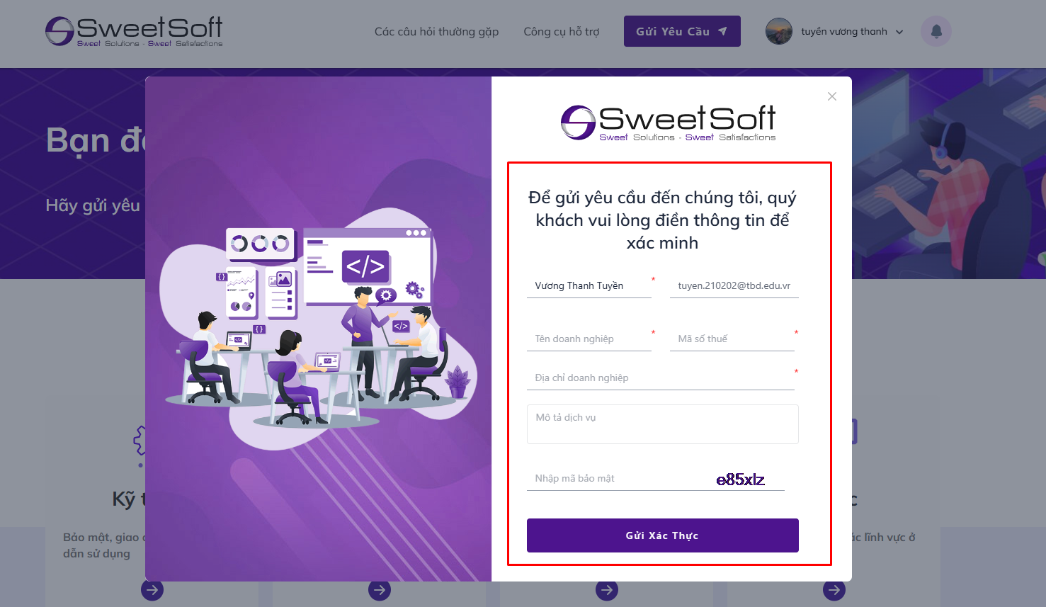➡️ Nếu Quý khách muốn gửi yêu cầu và màn hình hiển thị form yêu cầu xác minh, điều đó có nghĩa là SweetSoft chưa xác định được tài khoản của Quý khách thuộc khách hàng nào.